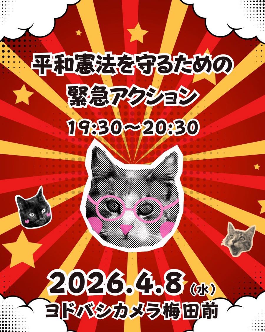 はるさめさんのXコピペしてご送付します 4月8日、東京の国会前のアクションと同じ時間に大阪でも連帯アクションを行います!! ⏱日時:4月8日 19:30~20:30 📍場所:大阪 梅田 (ヨドバシカメラ 梅田前) 手ぶら・飛び込み参加大歓迎です! #近畿ペンライト勢 #平和憲法を守る0408大阪